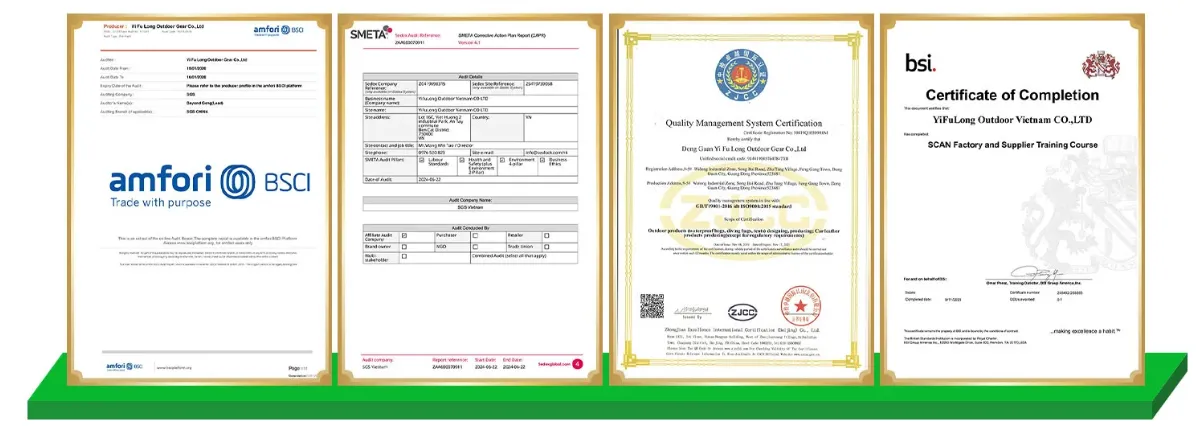 ພວກເຮົາໄດ້ຮັບການຮັບຮອງທີ່ມີອຳນາດຢ່າງຕໍ່ເນື່ອງ, ລວມທັງ ISO 9001 ສໍາລັບການຄຸ້ມຄອງຄຸນນະພາບ, BSCI/SMETA ສໍາລັບການຮັບຜິດຊອບສັງຄົມ, ແລະ Higg Index ສໍາລັບຄວາມຍືນຍົງດ້ານສິ່ງແວດລ້ອມ.
